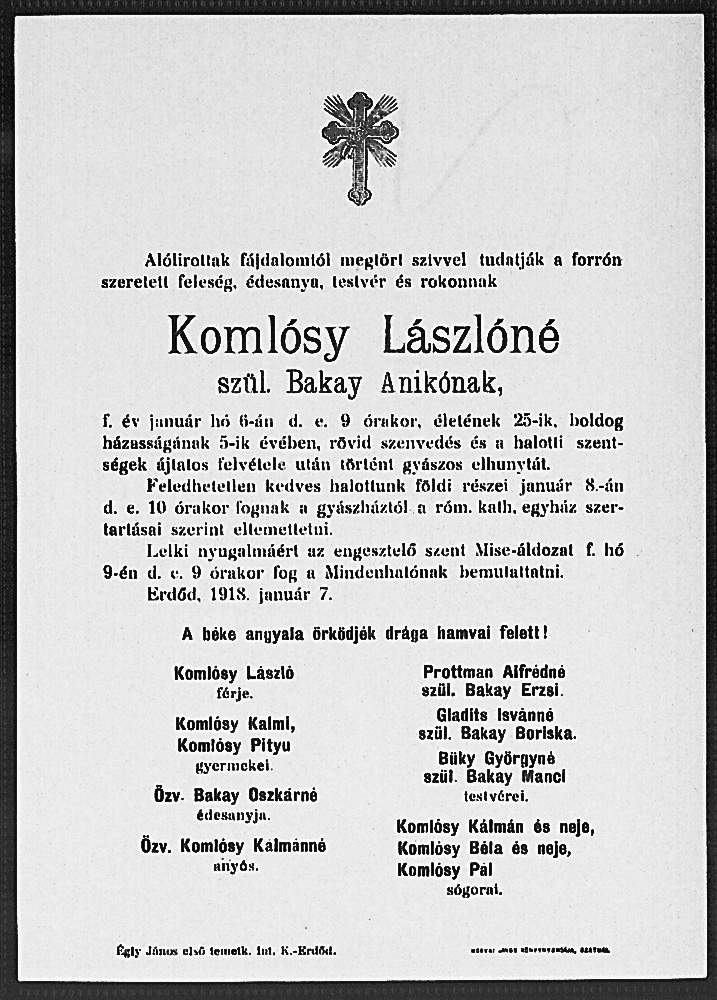 Komlósy Lászlóné sz. BakayAnikó gyászjelentése1918-01-07Komlósy László 1880 M004