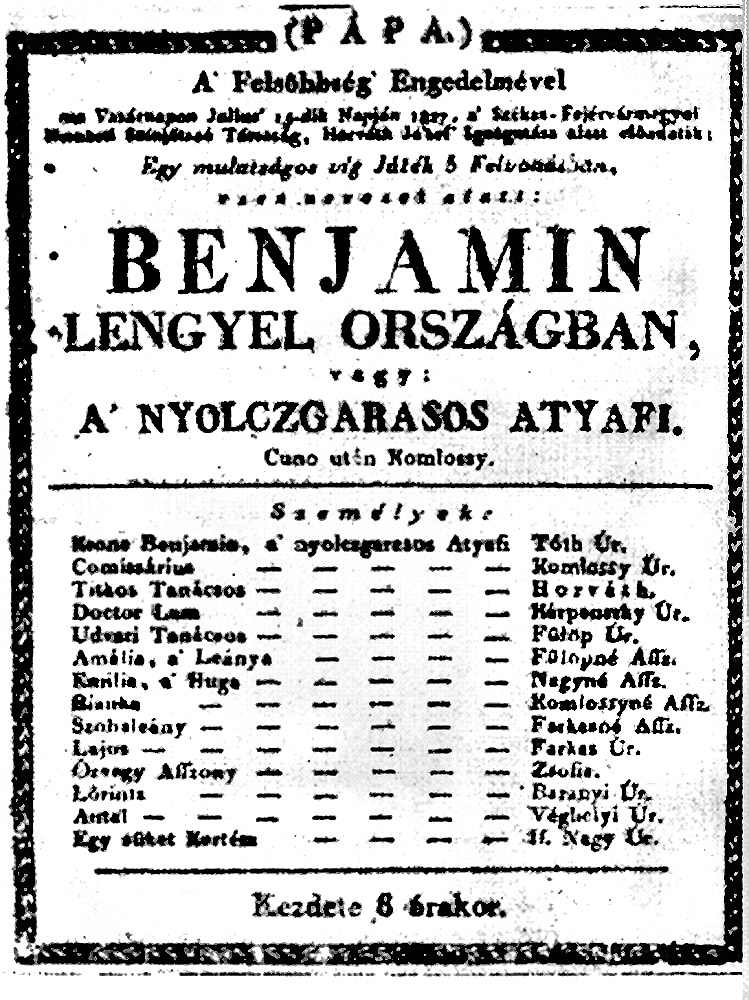 Színlap (Pápa)1827-07-15Komlóssy Ferenc Dániel 1797 X005