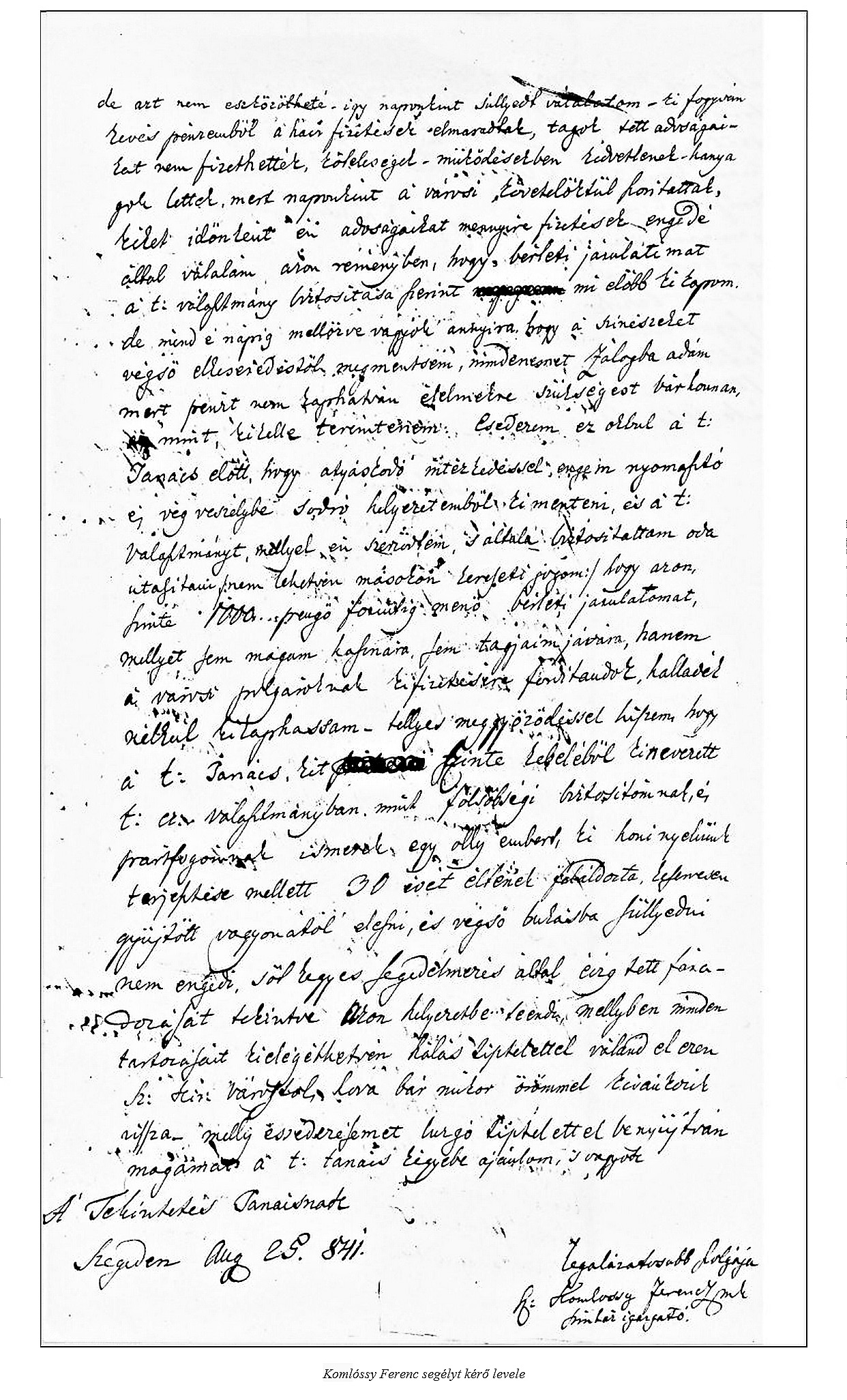 Komlóssy Ferenc levele Szeged város tanácsához1841-08-25Komlóssy Ferenc Dániel 1797 X005