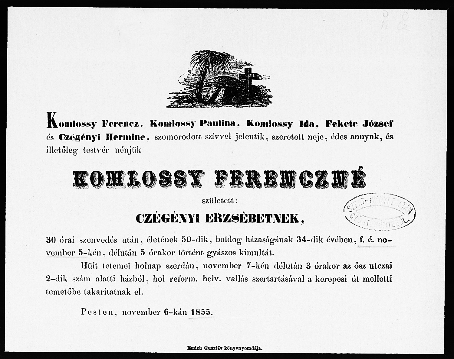 Komlóssy Ferencné Czégényi Erzsébet gyászjelentése1855-11-06Komlóssy Ferenc Dániel 1797 X005