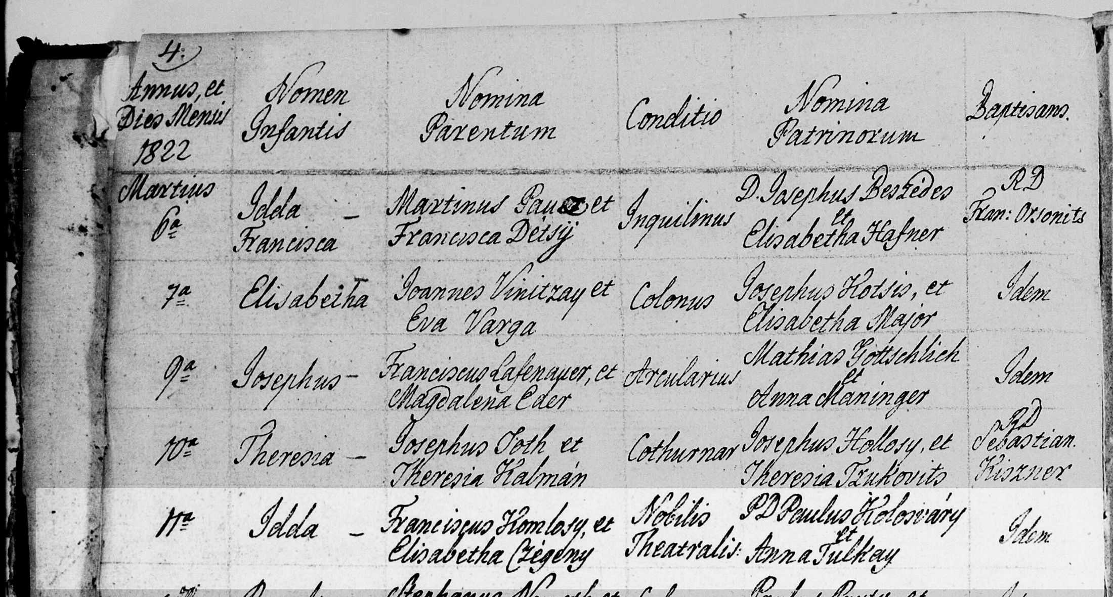Komlóssy Ida keresztelési anyakönyve1822Komlóssy Ida 1822 X006