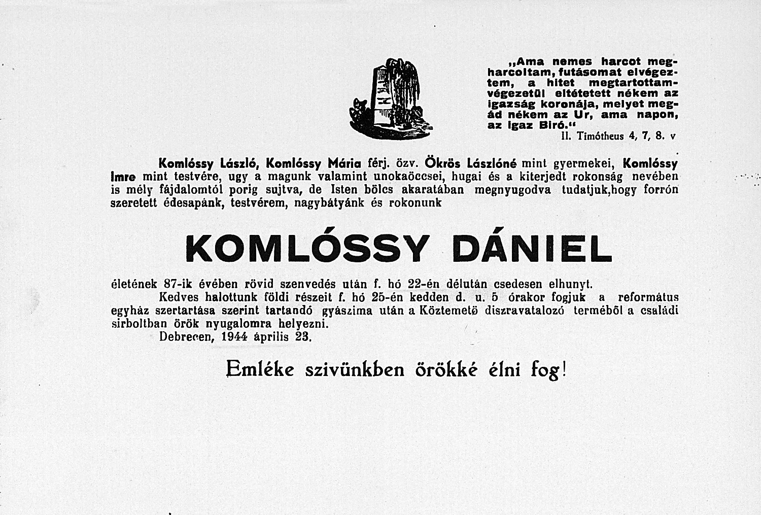 Komlóssy Dániel gyászjelentése1944-04-22Komlóssy Dániel 1858 U011