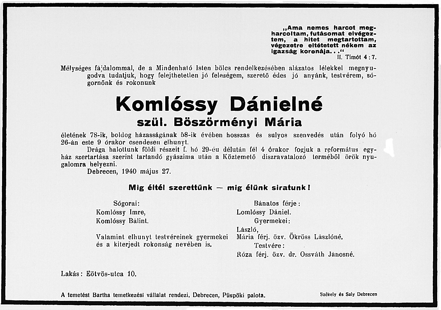 Komlóssy Dánielné Böszörményi Mária1940-05-26Komlóssy Dániel 1858 U011