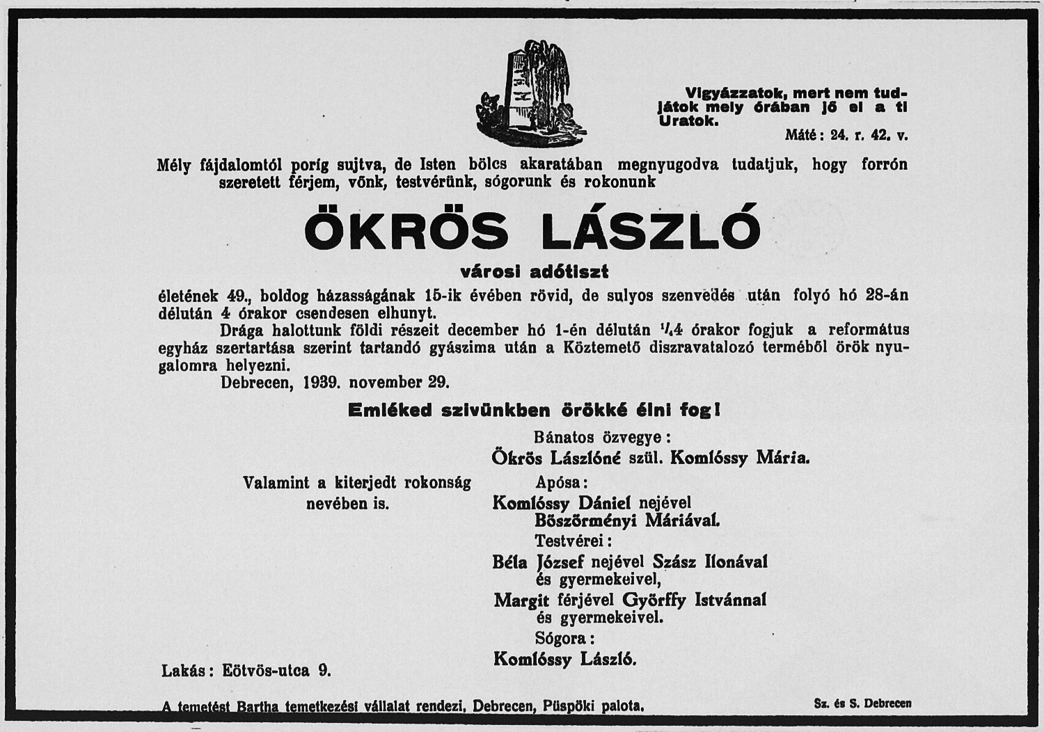 Ökrös László gyászjelentése1939-11-28Komlóssy Mária 1891 U012