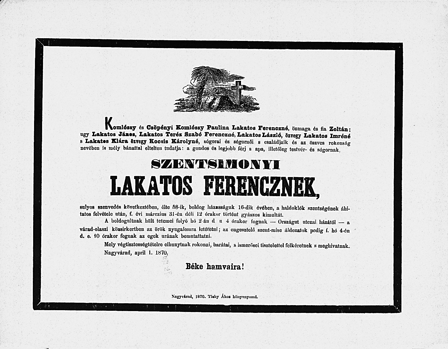 Lakatos Ferenc gyászjelentése1870-04-01Komlóssy Paulina ~1832 H048
