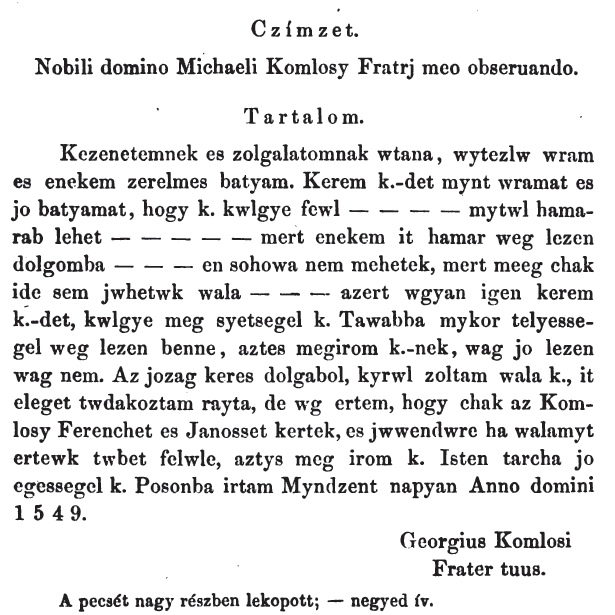 Komlósy György levele bátyjához Mihály(A085) Magyar Levelestár 56. levél1549-11-01Komlósy György ~1495 A060