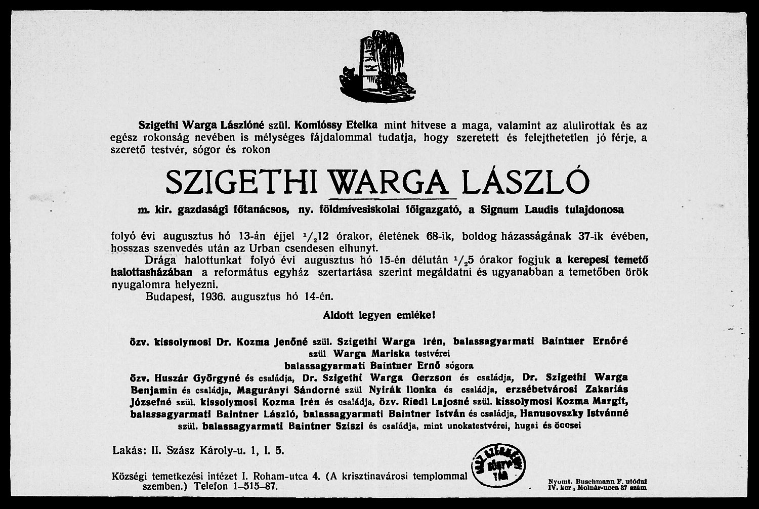 Szigethy Warga László gyászjelentése1936-08-13Komlósy Etelka ~1865 G046