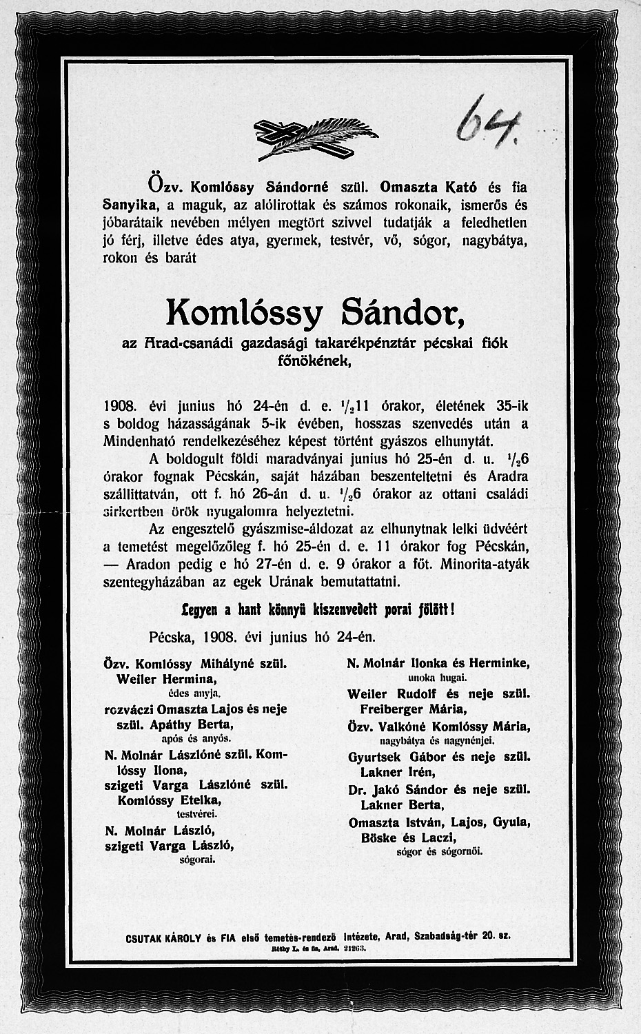 Komlóssy Sándor gyászjelentése1908-06-24Komlóssy Sándor 1873 G047