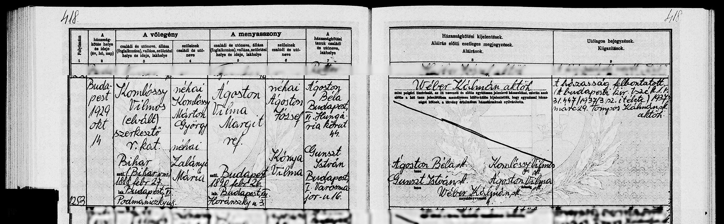 Vilmos-második házasságkötése - a válás bejegyzésével1929-10-14Komlóssy Vilmos 1888 H056