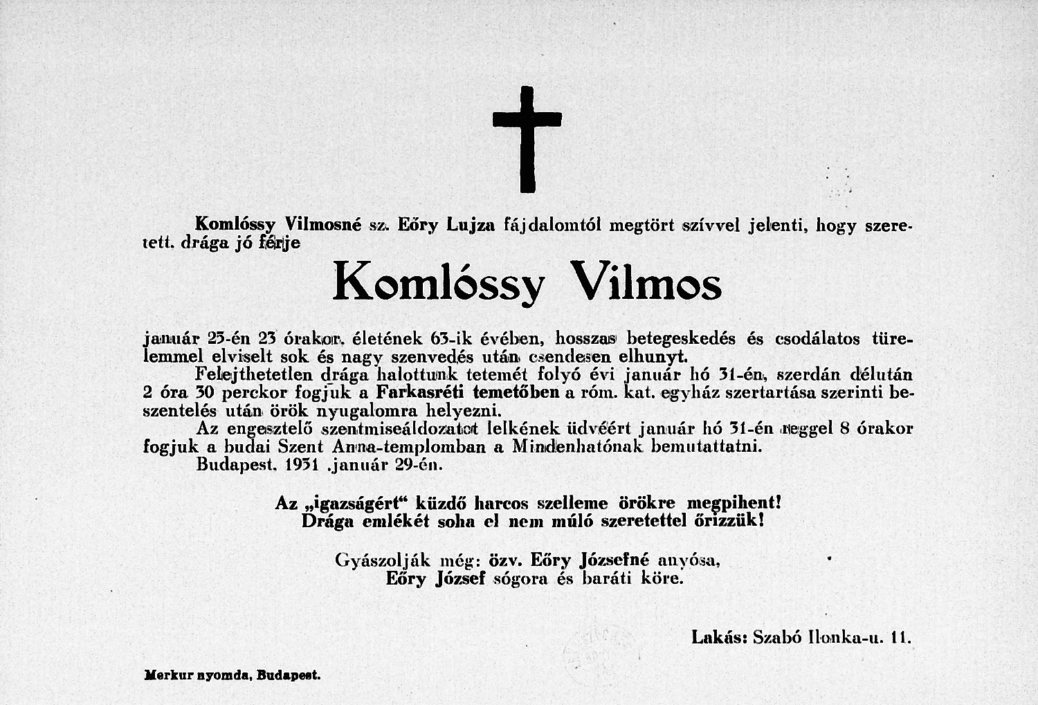 Komlóssy Vilmos gyászjelentése1951-01-25Komlóssy Vilmos 1888 H056