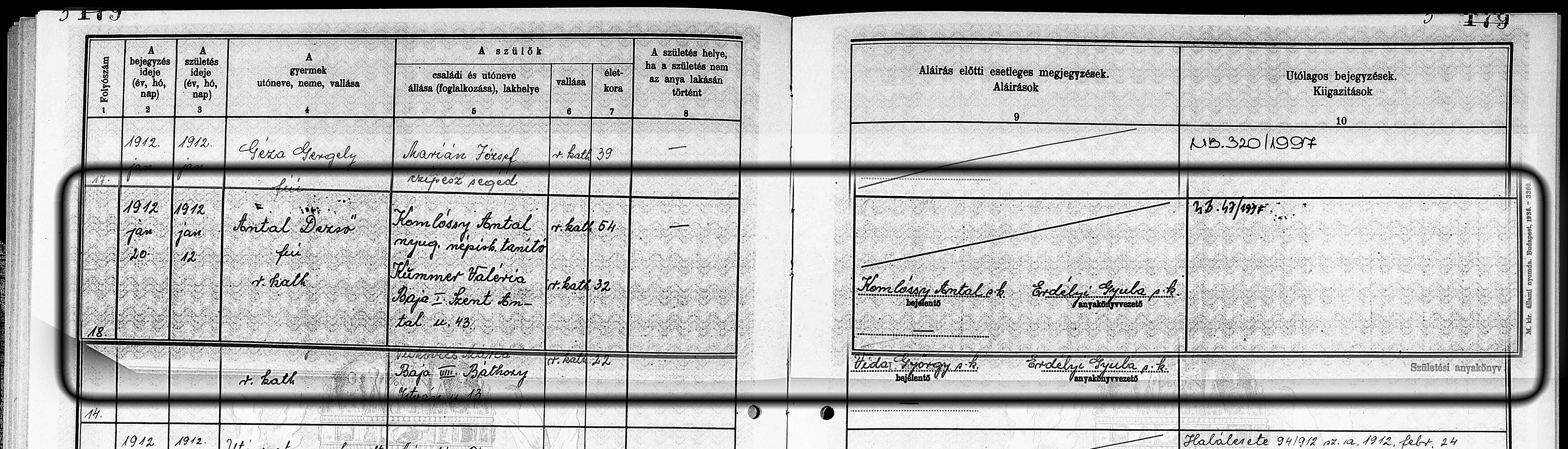 Komlóssy Antal-Dezső keresztelési bejegyzése a bajai plébánia anyakönyvében1912-01-12Komlósy Antal-Dezső 1912 P006